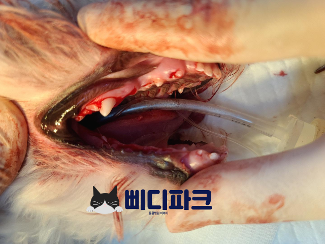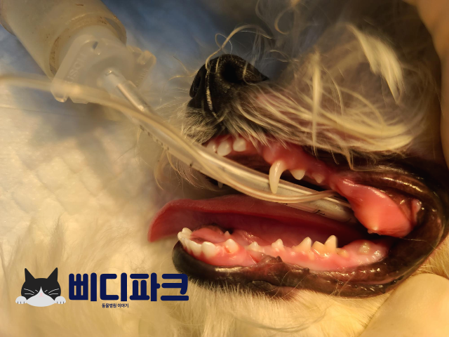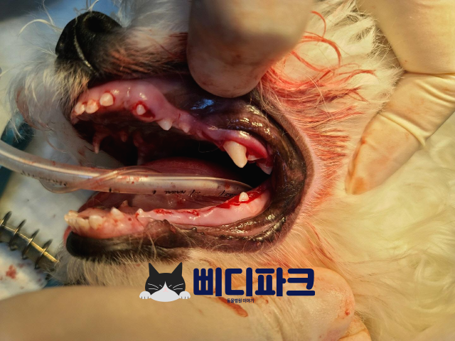 사진을 보시면 원래 있어야할 위턱 4번 전구치의 모습이 보이지 않는데요. 마취전 체크 시 안쪽의 치아가 촉진상으로 확인이 되는 상황이었습니다.소형견들의 경우 이런 식으로 치아가 치은을 제대로 뚫지 못하고 치은 덮개 아래에 존재하는 경우가 생각보다 많은데요.
